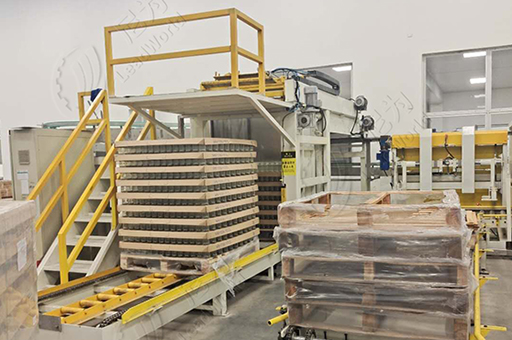 6)本機設計有空棧自動收集裝置,升降動力電機加以變頻控制,空棧托舉梁由氣缸帶動,可自動開合,碼垛整齊、方正。承載棧板數量可達12塊。