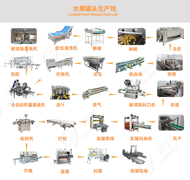 清洗——選剔——分級去核—護色—預煮—裝罐—排氣—封罐—殺菌—冷卻—實罐碼垛—實罐卸垛—貼標——開箱——裝箱—封箱——碼垛。