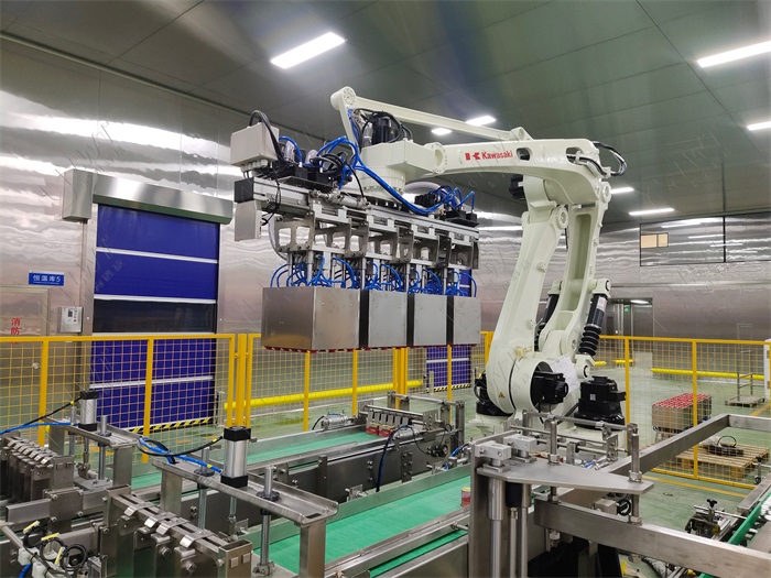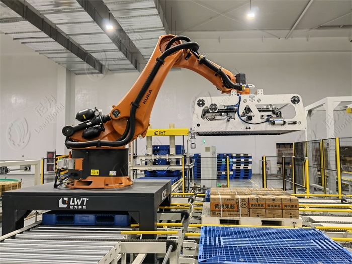 機(jī)器人碼垛機(jī)是機(jī)電一體化高新技術(shù)產(chǎn)品。可按照要求的編組方式和層數(shù),完成對料袋、膠塊、箱體等各種產(chǎn)品的碼垛。